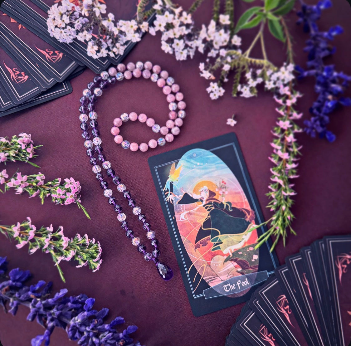 This beautiful “fairy Charm” knotted necklace spell was inspired by my sweet little daughter Selene, who bursts with love, joy, and potential like spring’s first blooms. Made with crackle Aura Crystal Quartz, heat-treated Amethyst, and natural Madagascar rose quartz, this charm was made with the intention to bring out the best potential in our psyche and circumstance through whimsy, imagination, play, and love.