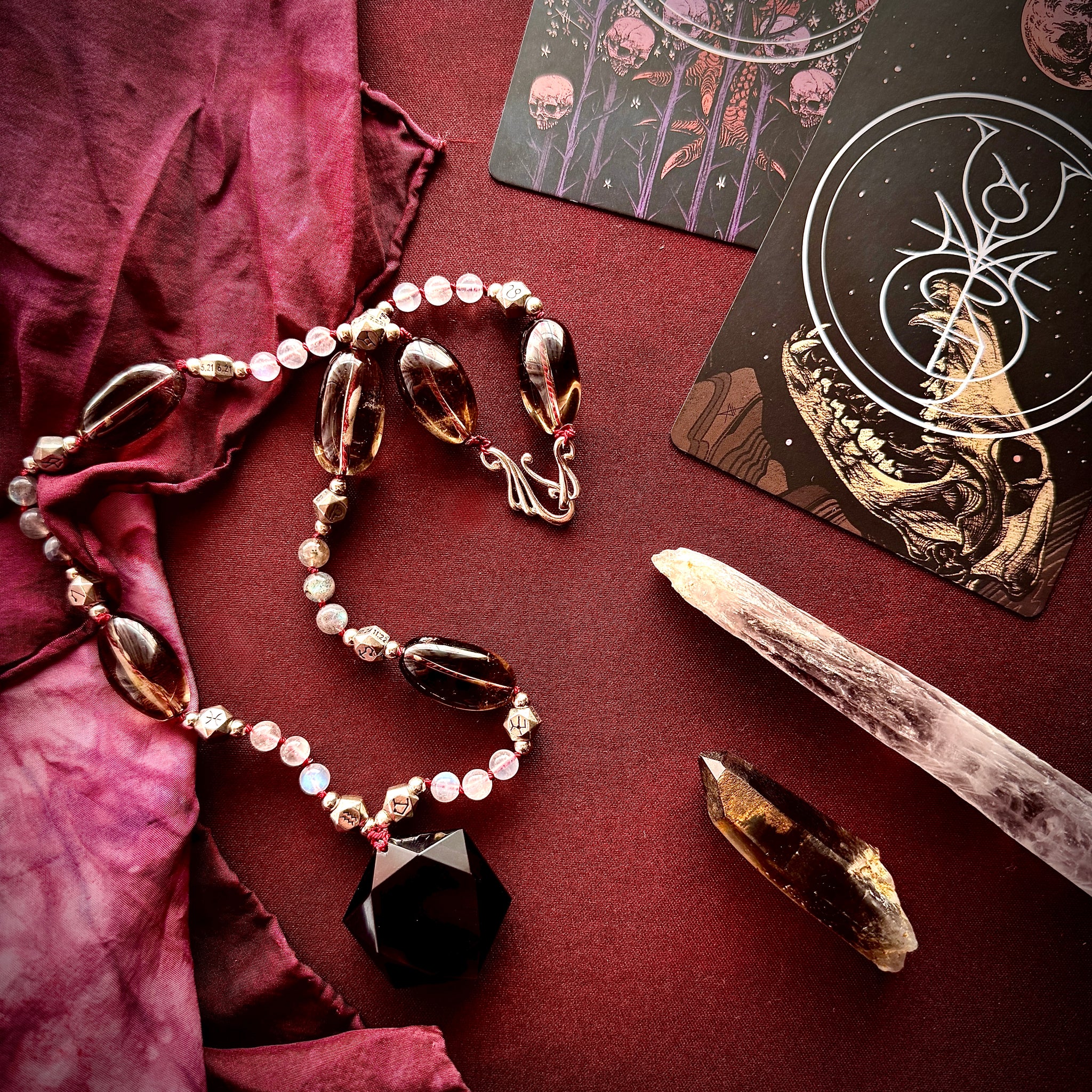 This woven & wearable spell is designed for spiritual and material protection. It uses large, natural, smooth Smokey quartz beads (a protective stone that shields against nightmares and transmutes negative energy into positive energy), Blue-flash Moonstone (which is said to bring peace, and be especially protective for travelers, women, and children, while also facilitating spiritual awareness and enhancing intuition) and Labradorite (also called The Shaman stone and said to act as a psychic and spiritual shield while facilitating spiritual growth and transformation) woven in segments of three, broken up by 12 sterling silver hexagonal beads engraved with the glyphs of the zodiac. This pendant opens and closes with Saturn’s signs (Aquarius and Capricorn) because it’s purpose is to to banish negative energies and influences, bind enemies so that they cannot work against you, and purge corruptive influences. 3 is a sacred number for saturn as a part of His magick square. Saturn rules over bindings, banishing, contracts, and restrictions and so His energy is used here to restrict and banish negative energies. The large Hexagonal smoky quartz focal bead is a beautiful piece in and of itself, and represents the interweaving of the spiritual and the material—in this case, offering both forms of shielding and protection when necessary.